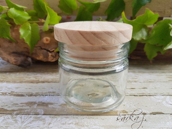 Skleněná dóza s těsnícím dřevěným víčkem.