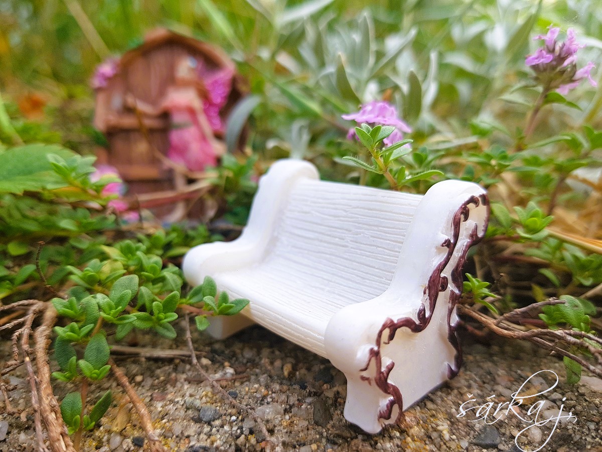 Bílá lavička s dekorem určena do mini-zahrádek, plantárií, k dekorace miniatur.