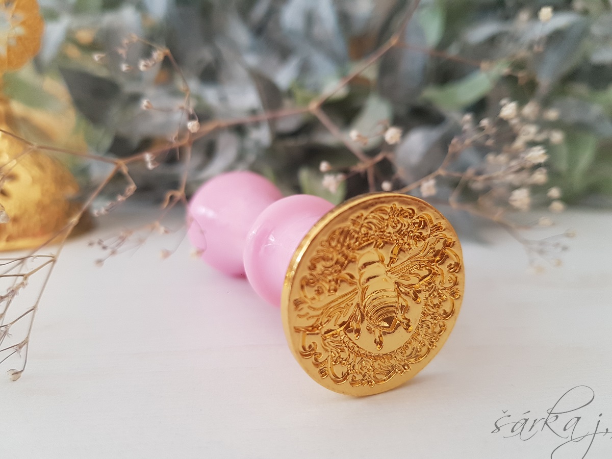 Pečetní razítko s motivem včelky. Raznice je šroubavací k rukojeti, raznice se může pohodlně vyměnit za jinou nebo dokupovat jen hlavice, bez rukojeti.