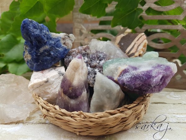V mixu se nacházejí různé druhy typově ametyst, sodalit, tygří oko, jadeity, růženín, křišťál, acháty, magnezit, mix obsahuje i drúzičky.