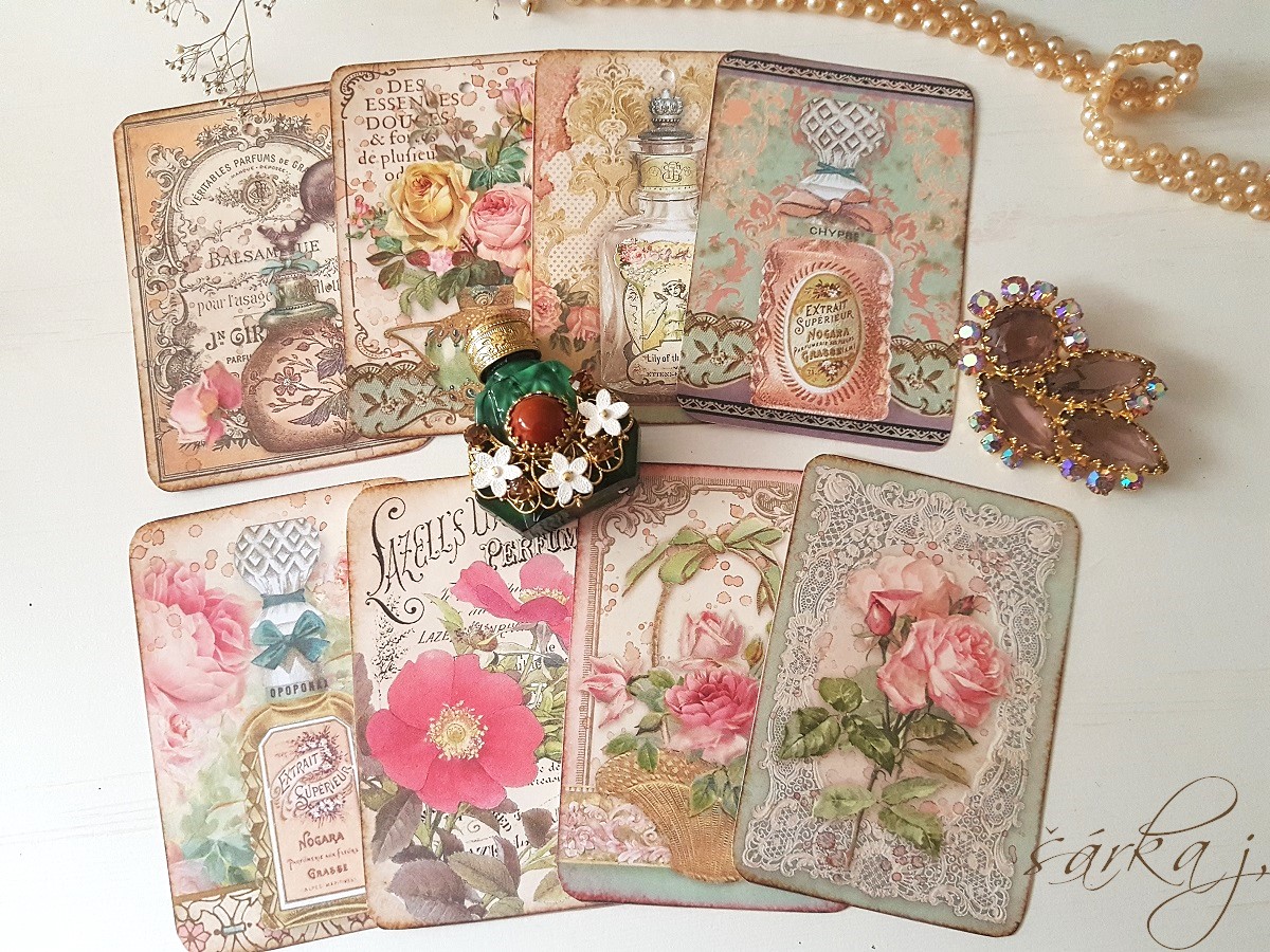 Papírové dárkové kartičky - visačky - s motivem květin a parfémů ve stylu dávných časů.
